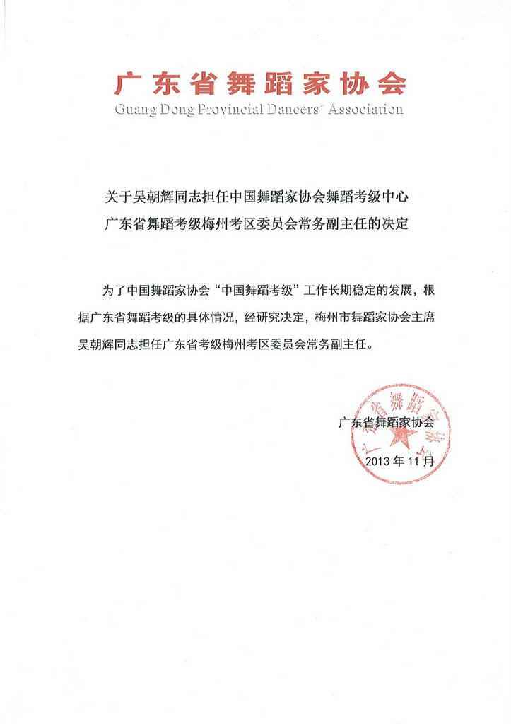 关于吴朝辉同志担任中国舞协舞蹈考级梅州考区常务副主任的决定