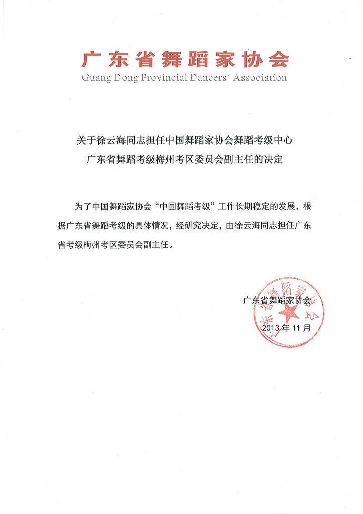 关于徐云海同志担任中国舞协舞蹈考级梅州考区副主任的决定